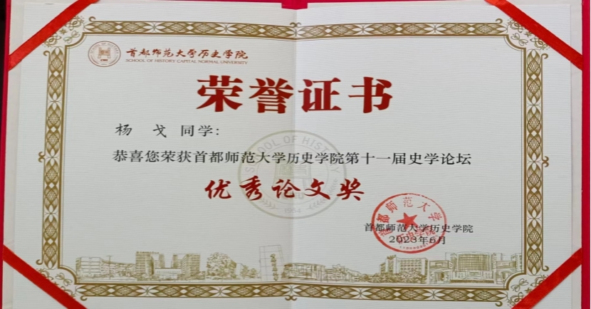 1、2023年6月由21级硕士研究生杨戈撰写的论文《汉魏六朝史评中的汉桓帝形象》获首都师范大学谈球吧官方网站第十一届史学论坛优秀论文奖
