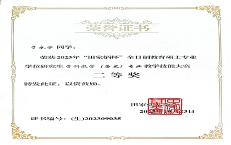 1、2023年10月2022级硕士研究生于永宁在2023年全国“田家炳杯”全日制教育硕士专业学位研究生学科教学(历史)教学技能大赛中获得二等奖