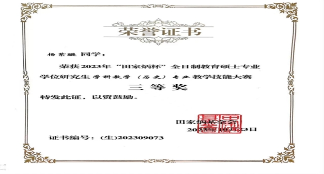 2、2023年10月2022级硕士杨紫璇在2023年全国“田家炳杯”全日制教育硕士专业学位研究生学科教学(历史)教学技能大赛中获得三等奖