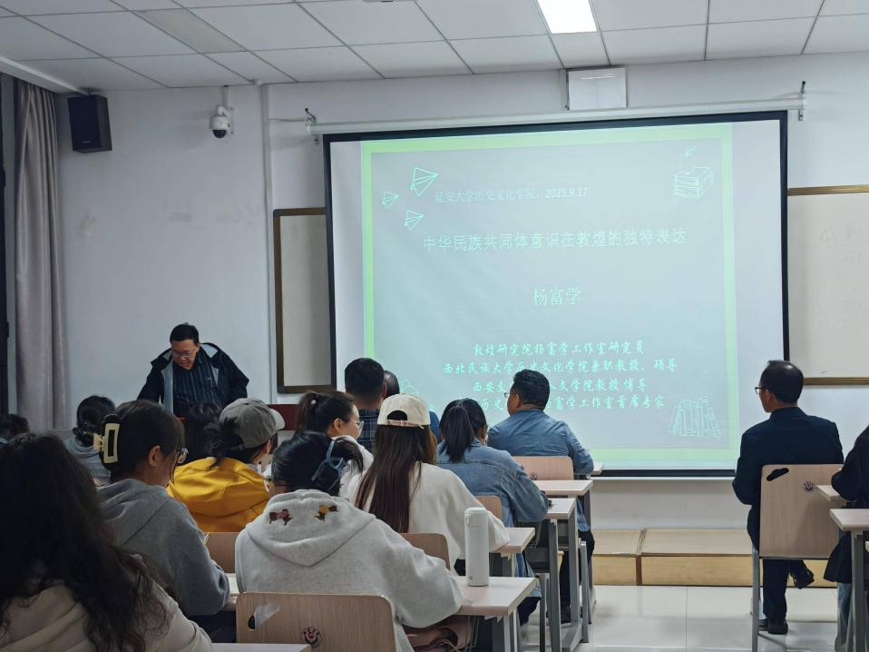 9月17日,应谈球吧官方网站邀请,敦煌研究院杨富学研究员在公司412教室作了题为《中华民族共同体意识在敦煌的独特表达》的学术报告。本次讲座由谈球吧官方网站贺知章副教授主持,公司各院系近百名师生到场聆听。
